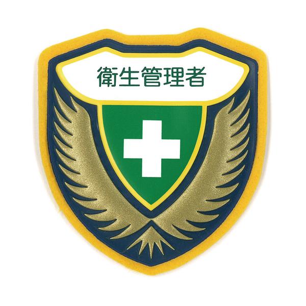 【説明】"●立体型で高級感がありながら、ソフトな手触りのワッペンです。<br>●フェルト地をビニールで特殊加工した手触りのよい立体ワッペンです。<br>●柔らかくて、丈夫です。<br><br>●当該情報の明示、啓発に。<br><br>●表示内容:衛生管理者<br>●縦(mm):73<br>●横(mm):67<br>●取付方法:安全ピン式<br>●厚さ(mm):2<br><br>●裏面安全ピン付<br>●特殊立体加工<br><br>●本体:フェルト生地<br>●表面:軟質塩化ビニール<br><br>●安全ピン<br><br>…保護具 作業服 腕章・胸章…"