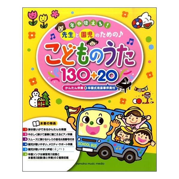 年間のうた、毎月のうたにも選びやすい、季節の童謡やイベントに使える曲、毎日歌える園生活のうた、園児からもリクエストされるような人気曲、定番の卒園ソングなど、盛りだくさんの130曲をそろえました。